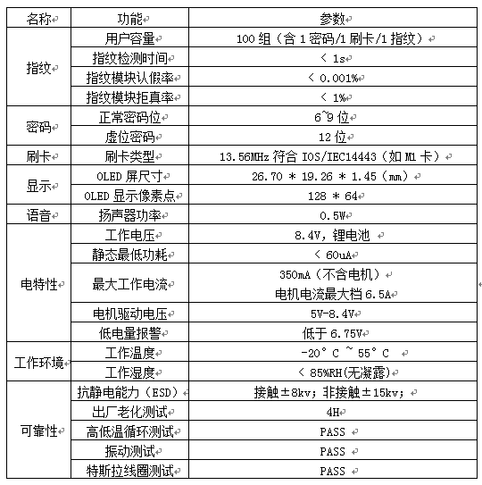 ◆ 電量控制功能:每次開門實時電量檢測并顯示,電池槽5格,當電量低于10-20%時在顯示屏提醒用戶。